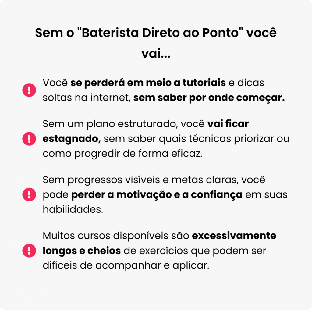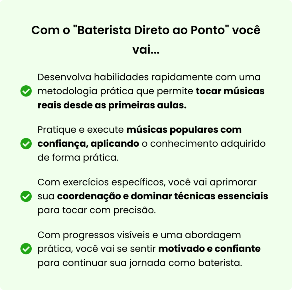 No "Baterista Direto ao Ponto", você aprenderá a tocar bateria de maneira rápida e eficaz, focando apenas no essencial para tocar 90% das músicas populares.